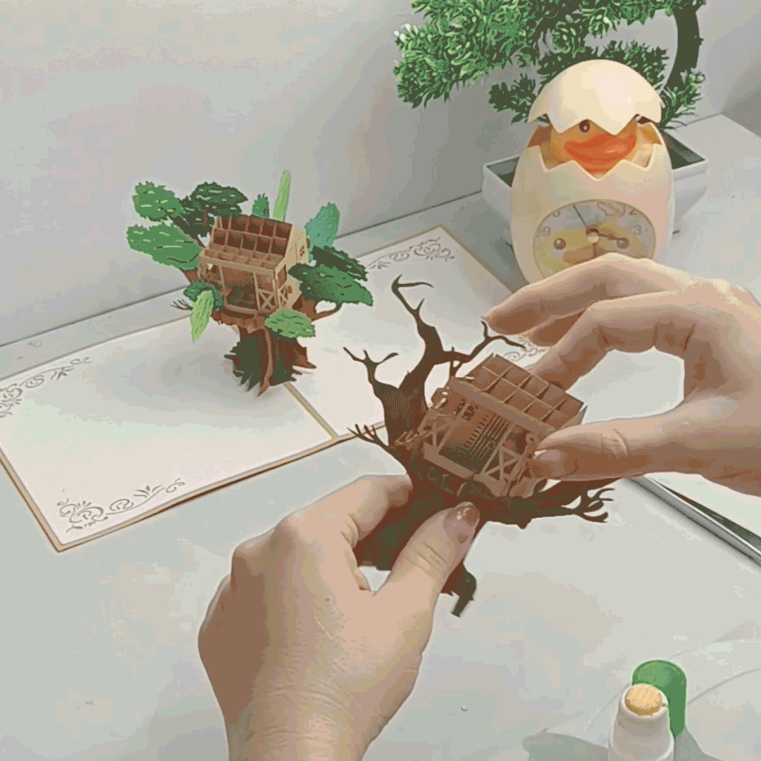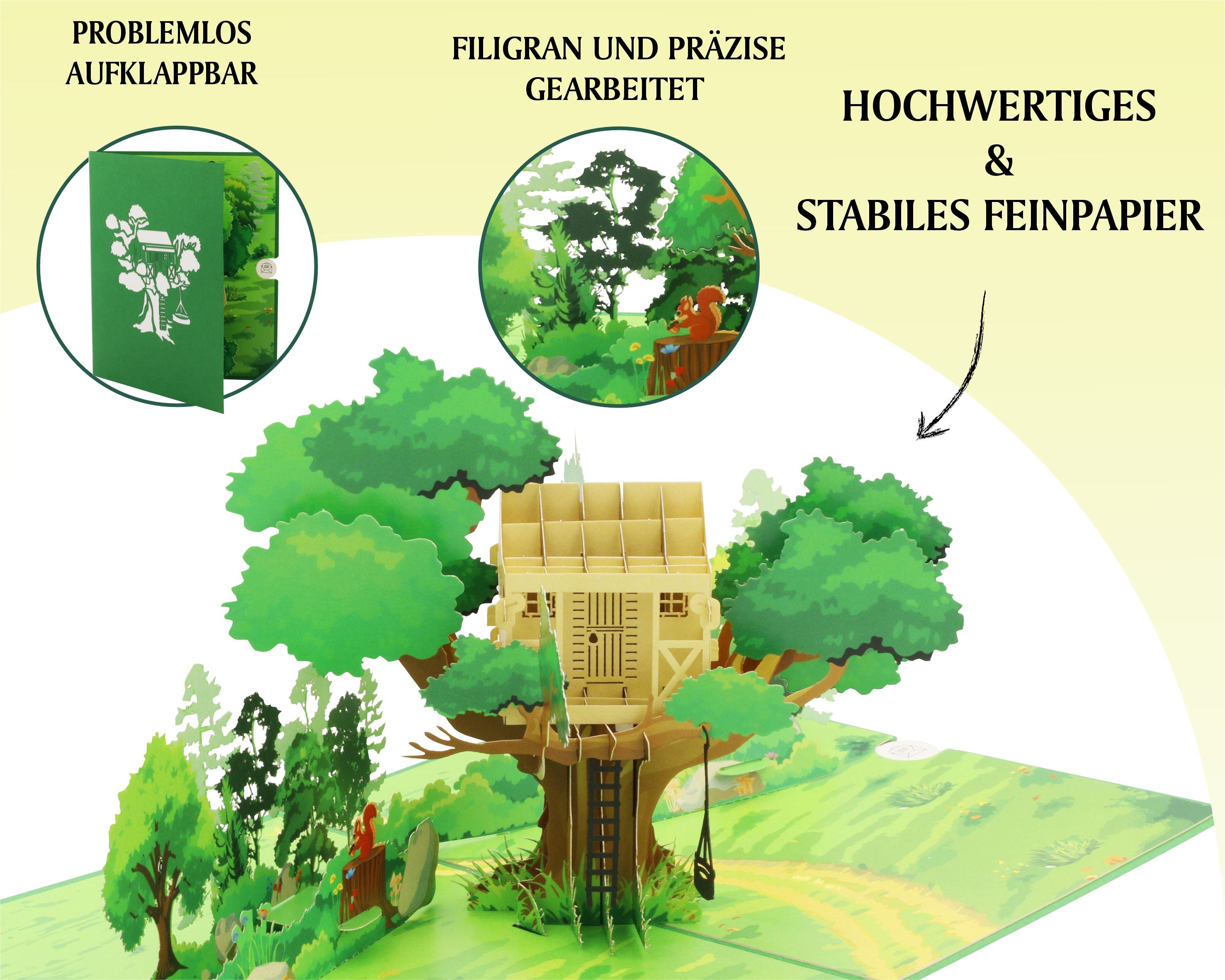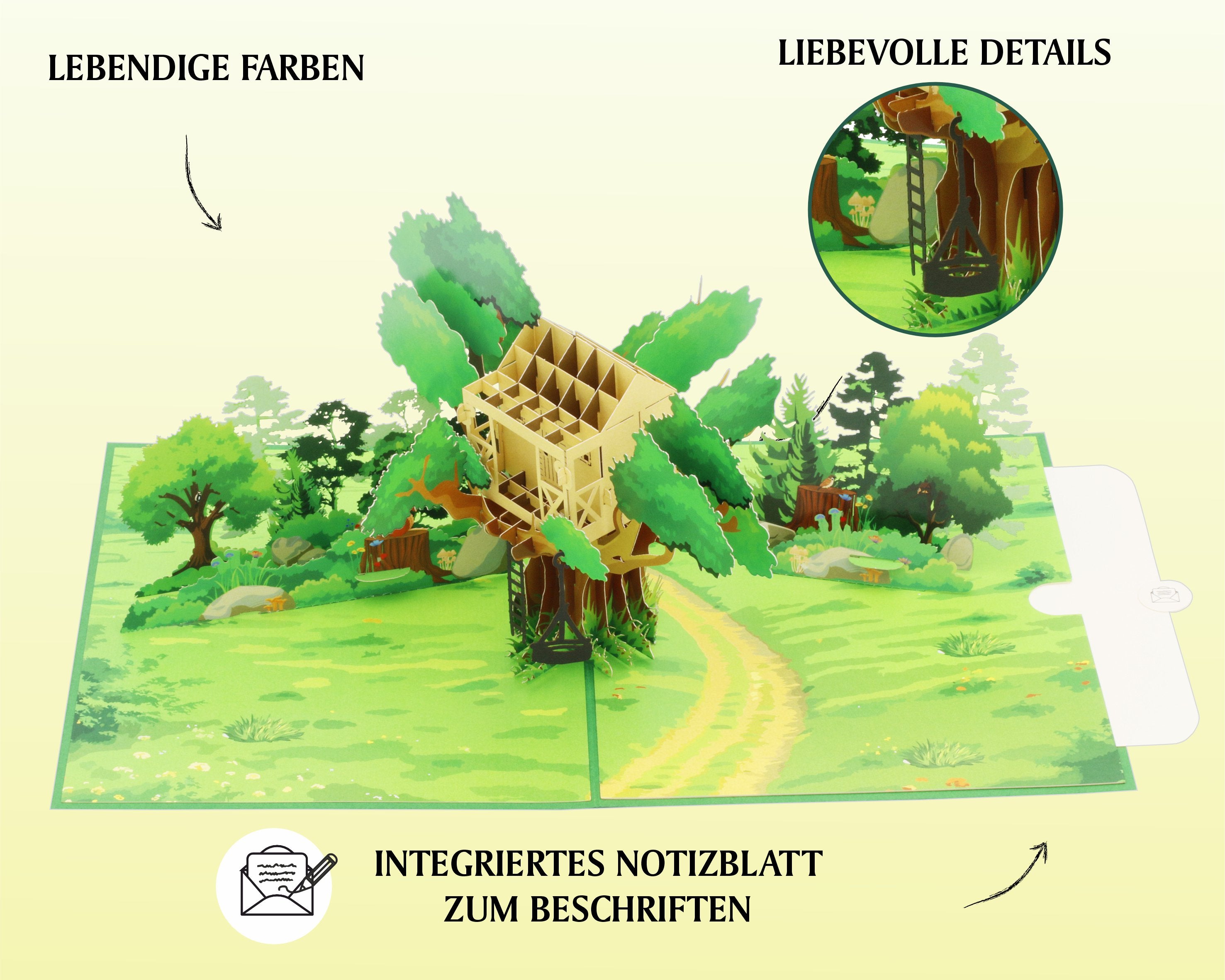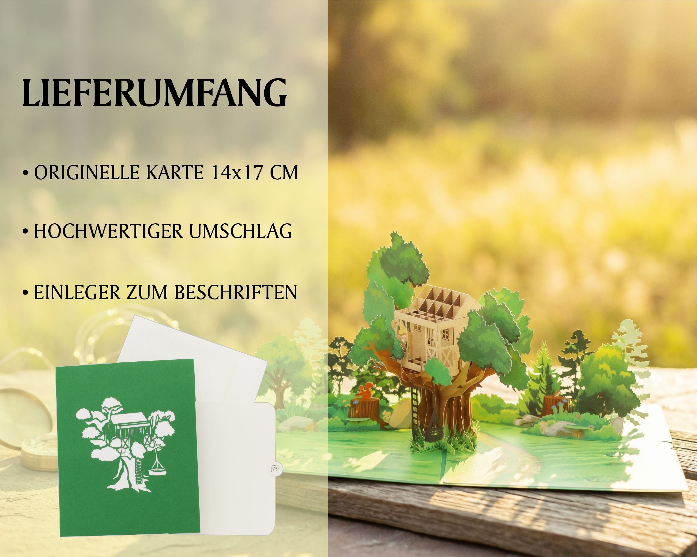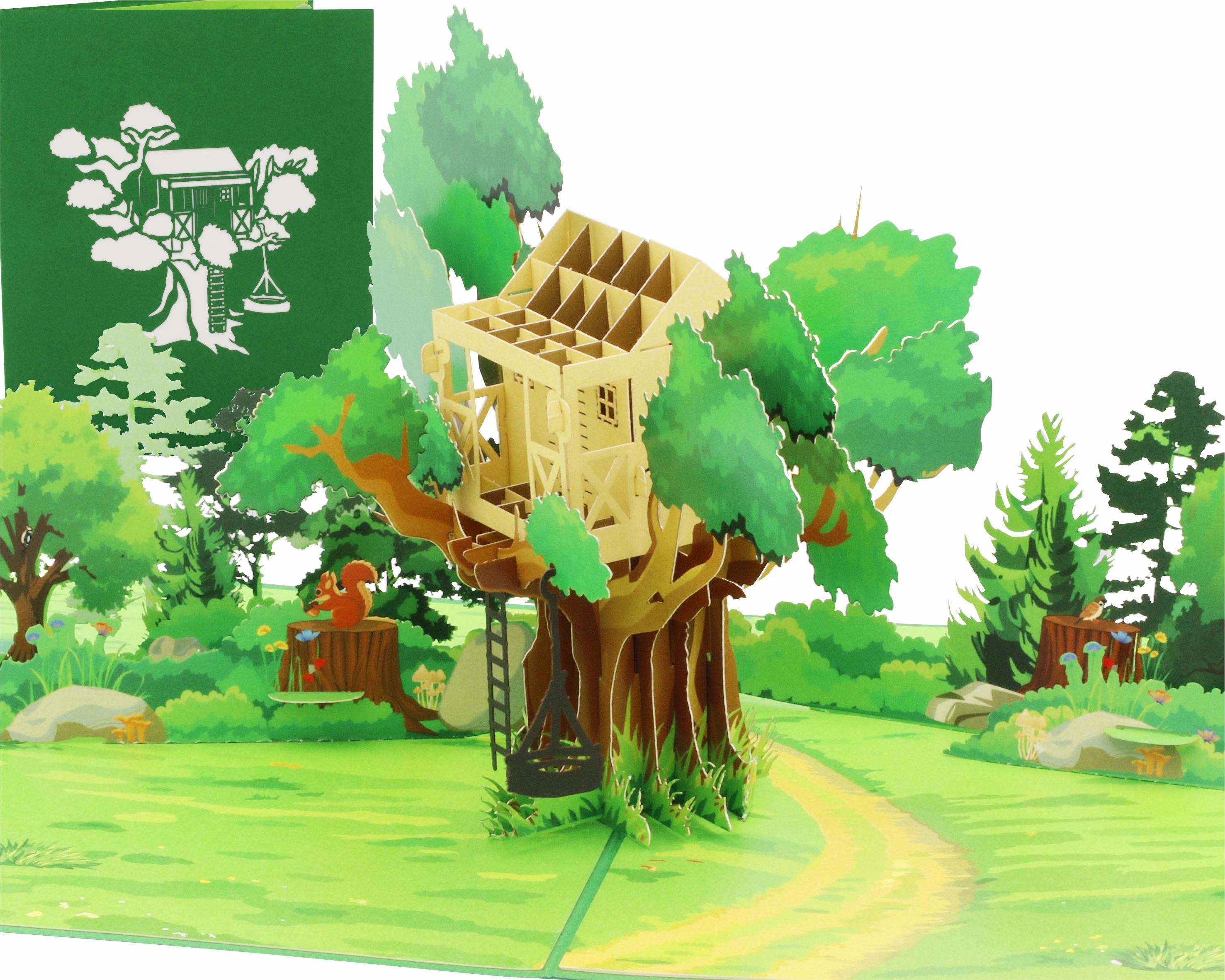 Beim Aufklappen dieser 3D Karte verzaubert Sie ein filigran gearbeitetes Baumhaus, der Traum eines jeden Kindes.
