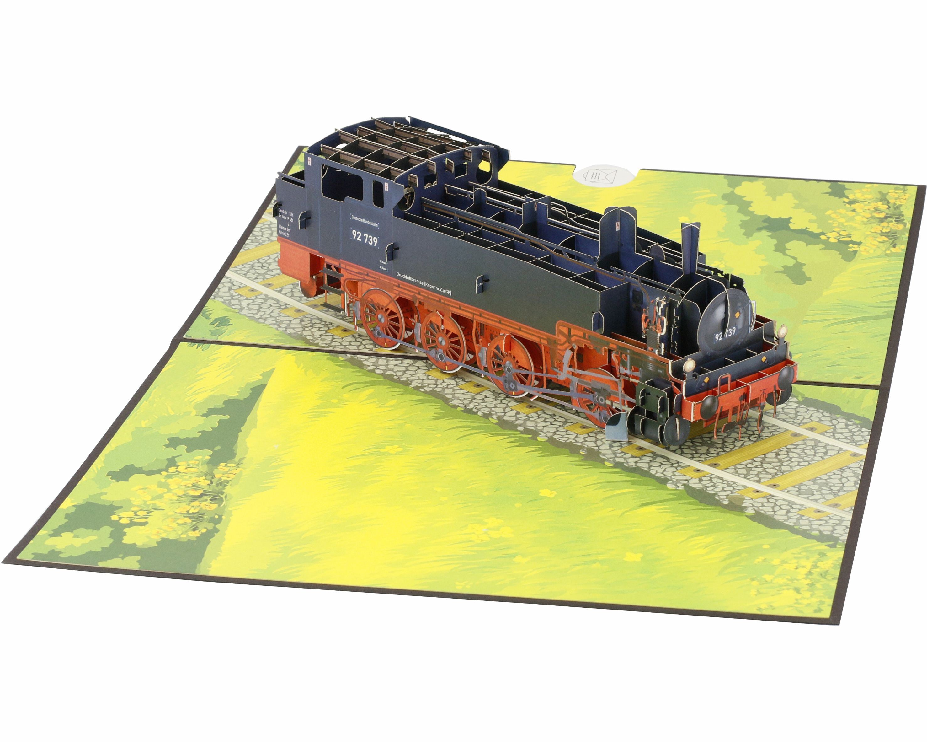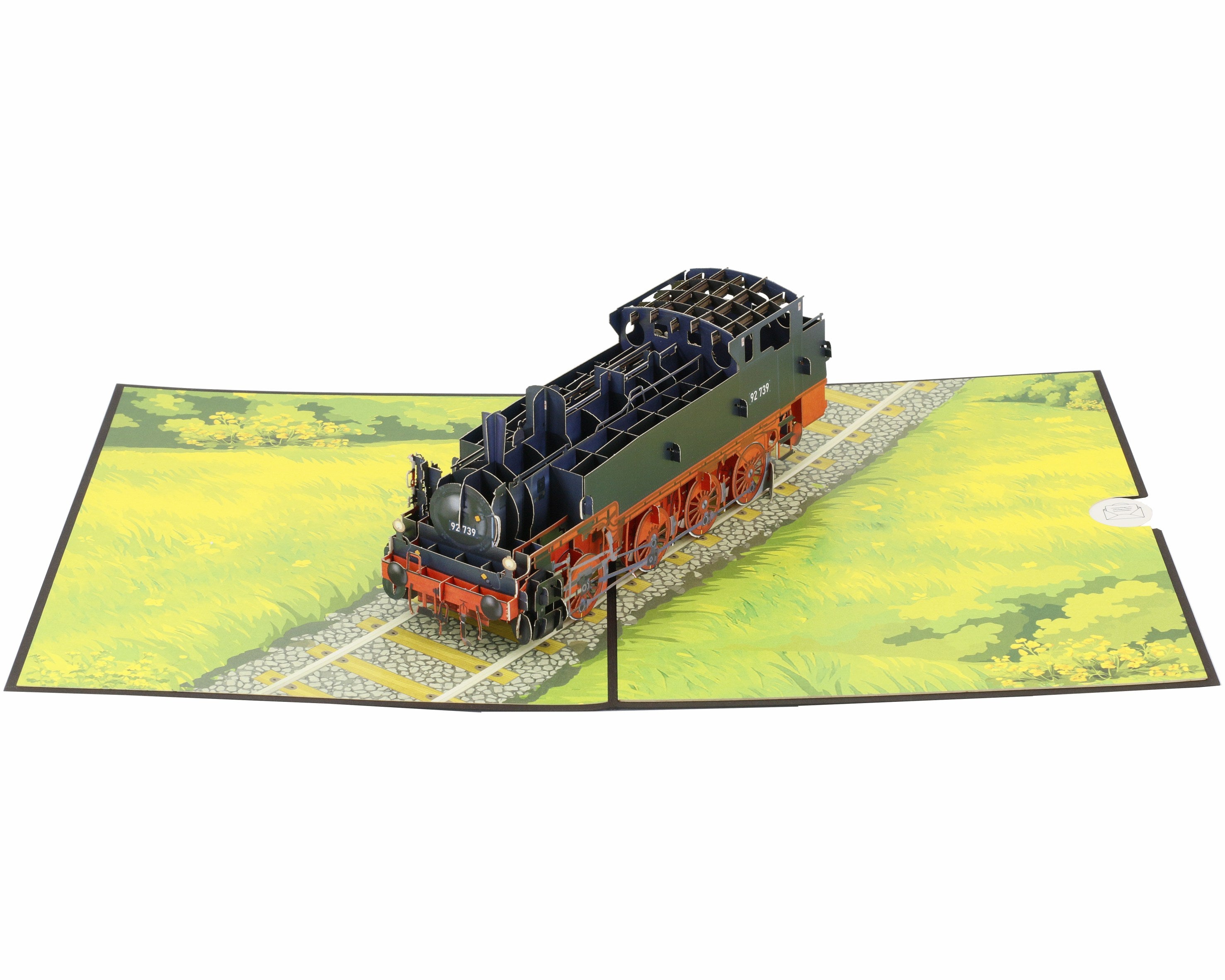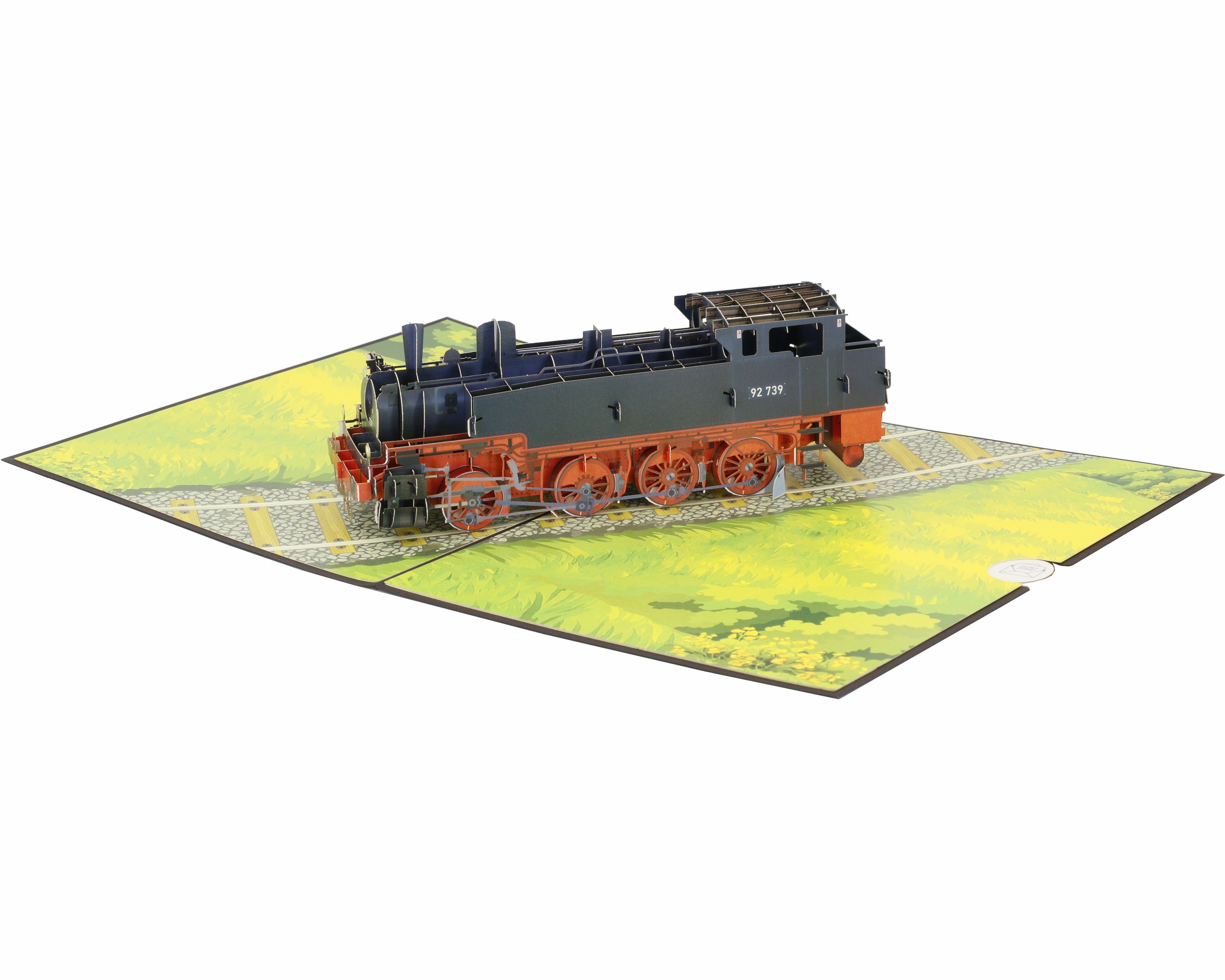 Beim Aufklappen dieser 3D Karte verzaubert Sie eine filigran gearbeitete Lokomotive, die unermüdlich über die Gleise rollt.