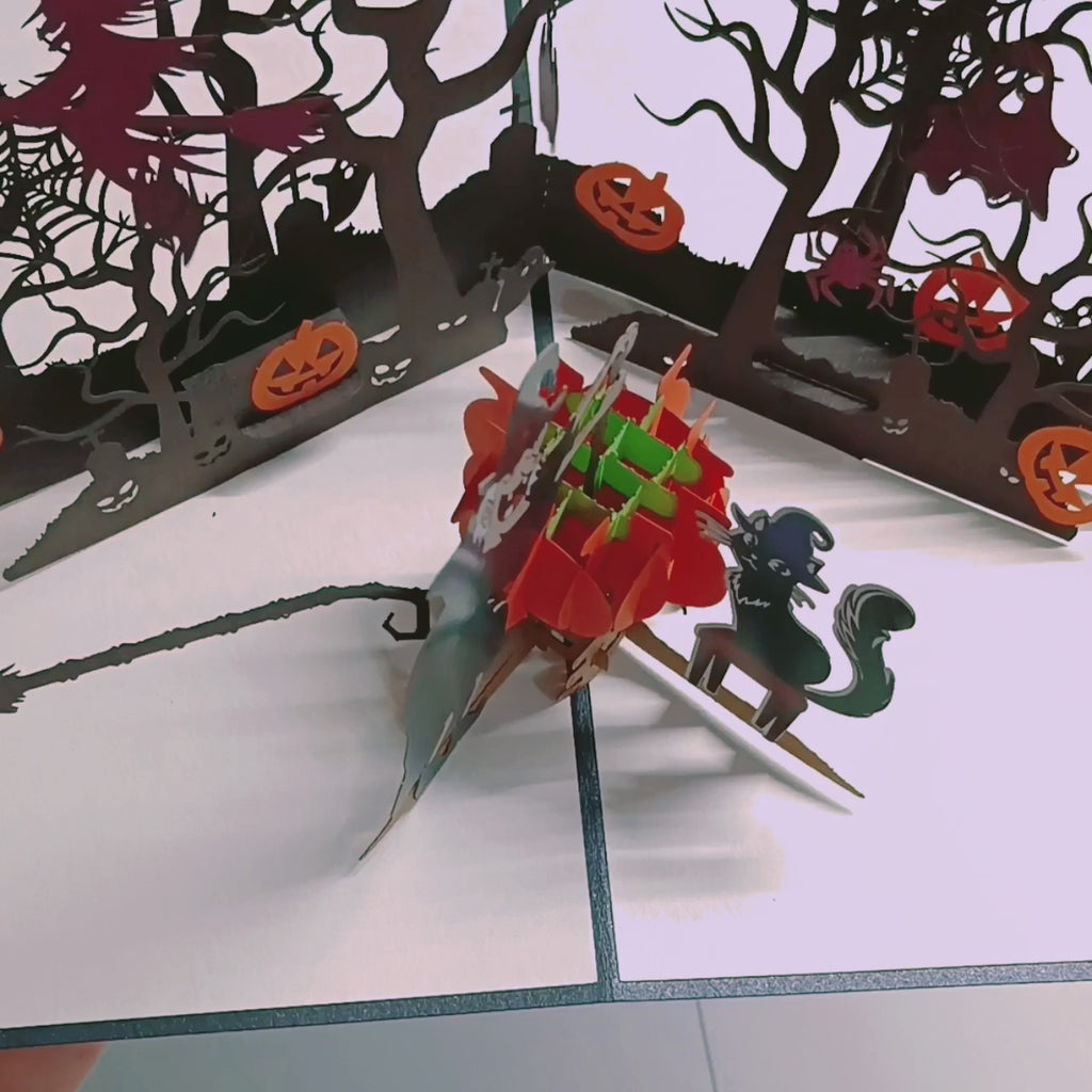 Unsere Pop-Up Halloween Karte mit Hexe und schwarzer Katze entfaltet beim Öffnen eine gespenstische 3D-Szenerie, die direkt in eine düstere Halloween-Nacht entführt: Hexe auf dem Besen, schwarze Katze, lachende Kürbisse und eine mystische Gruselkulisse – alles aus edlem Papier, kunstvoll gelasert und von Hand zusammengebaut.