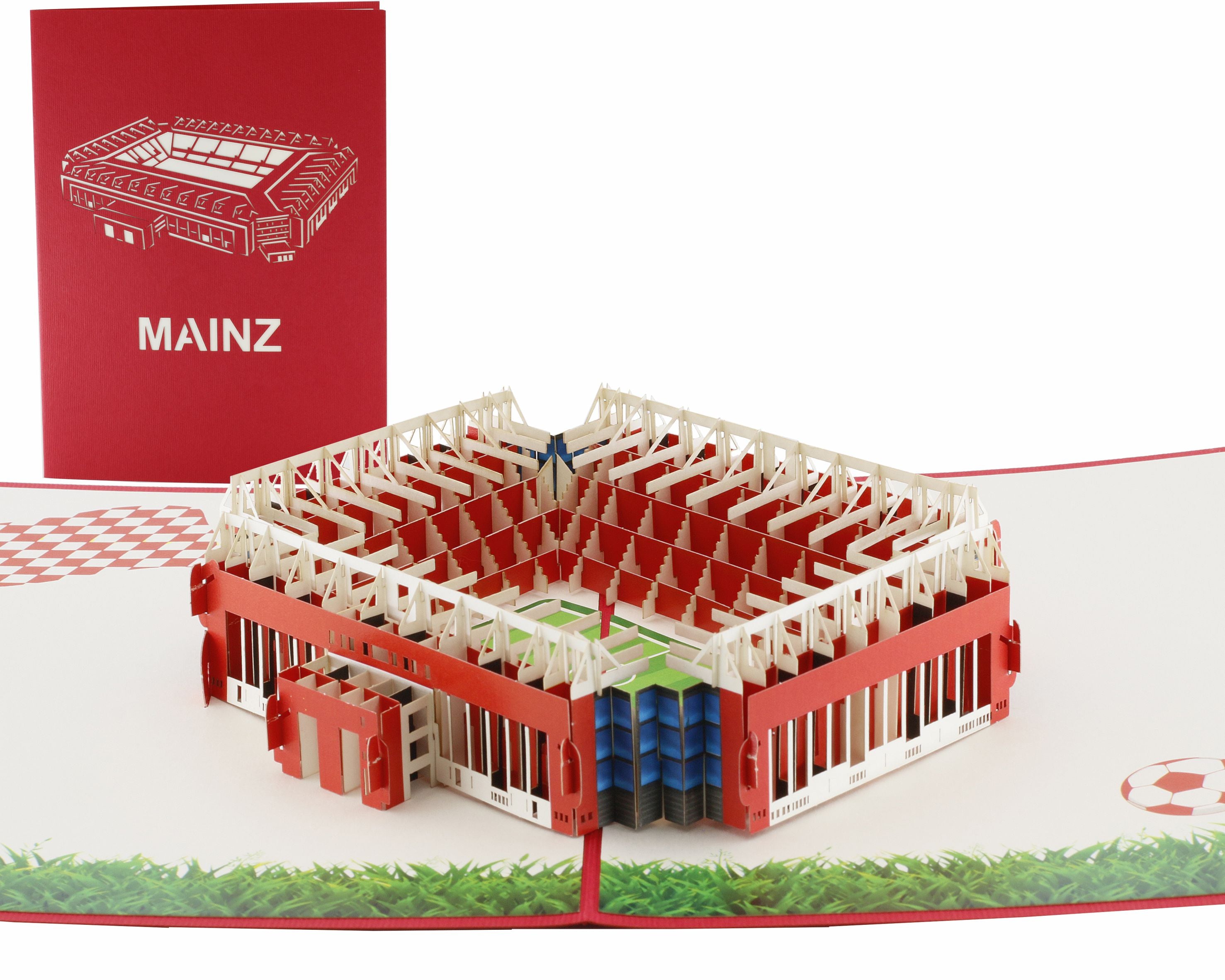 Unsere Pop-Up Karte Fußballstadion Mainz bringt die Heimspiel-Atmosphäre direkt ins Wohnzimmer. Beim Öffnen entfaltet sich ein filigran gestaltetes 3D-Stadion,