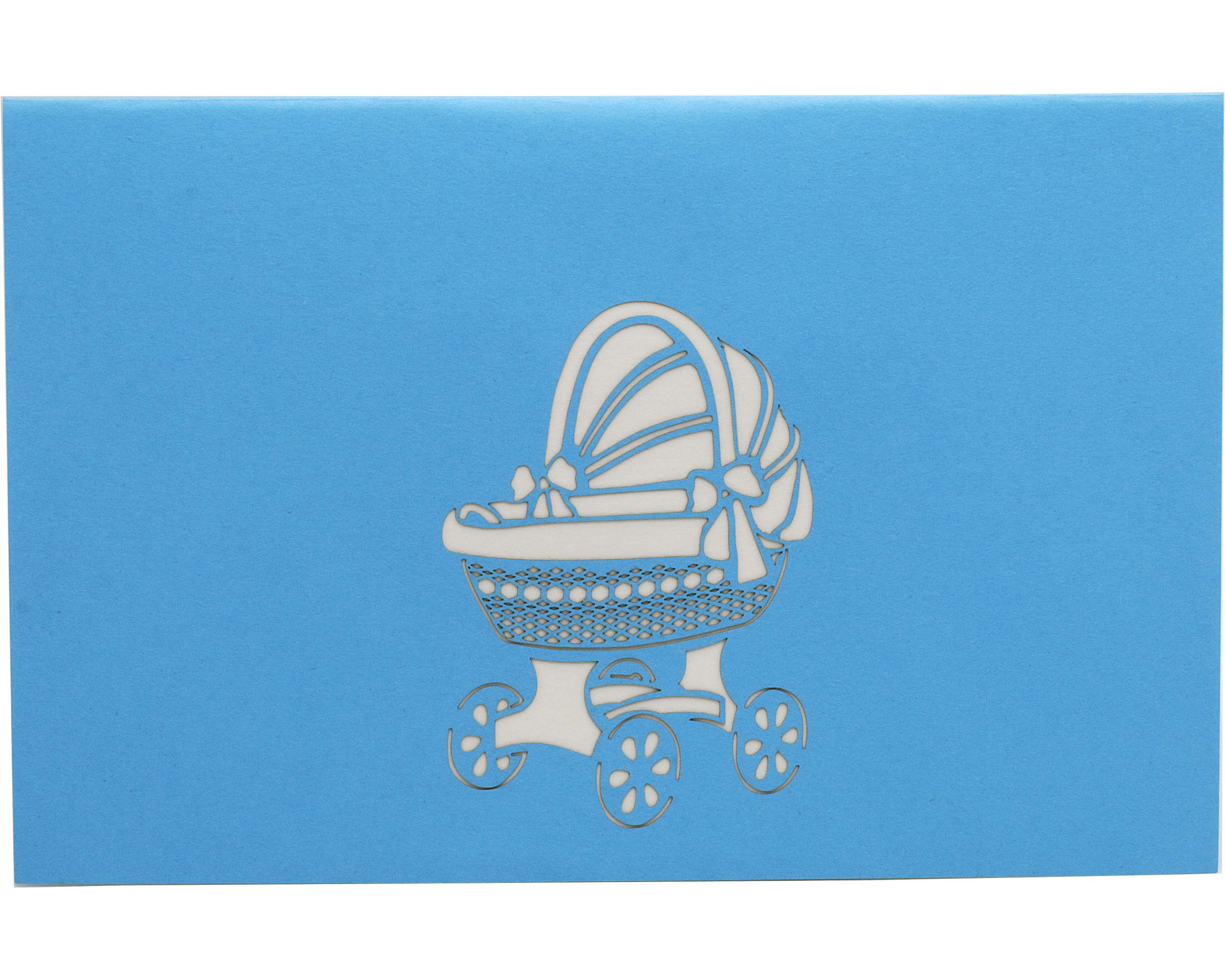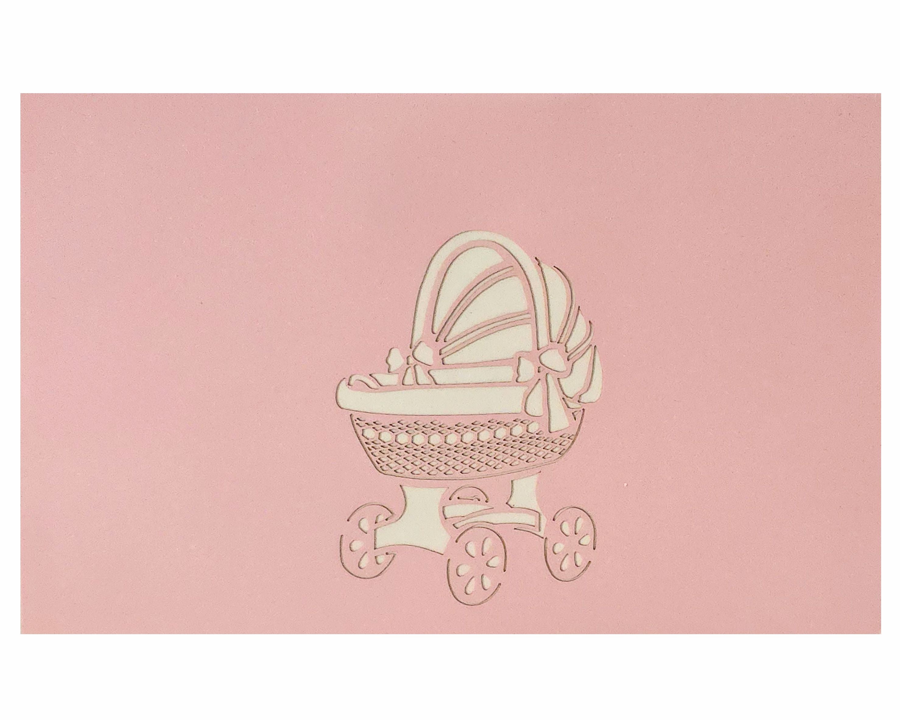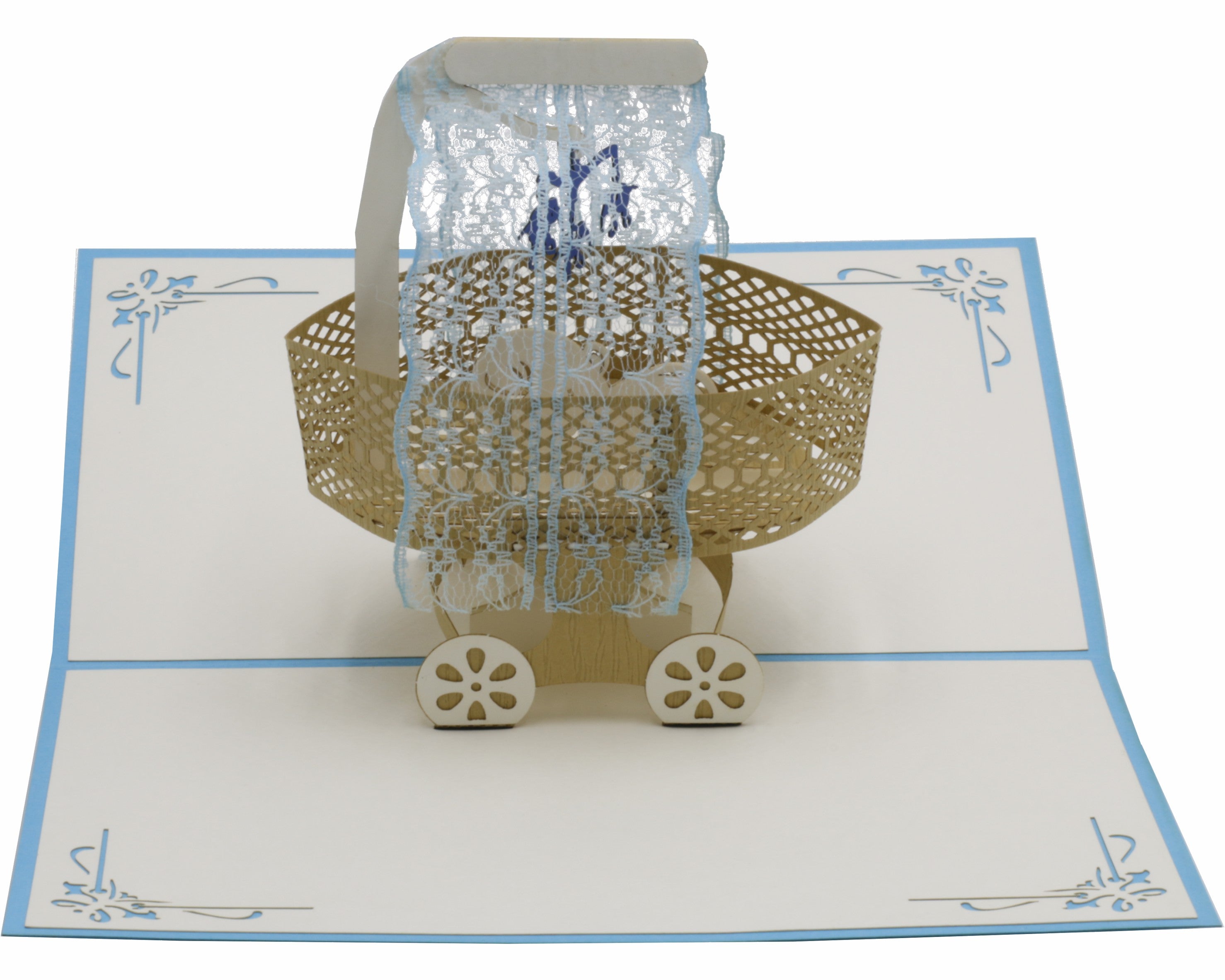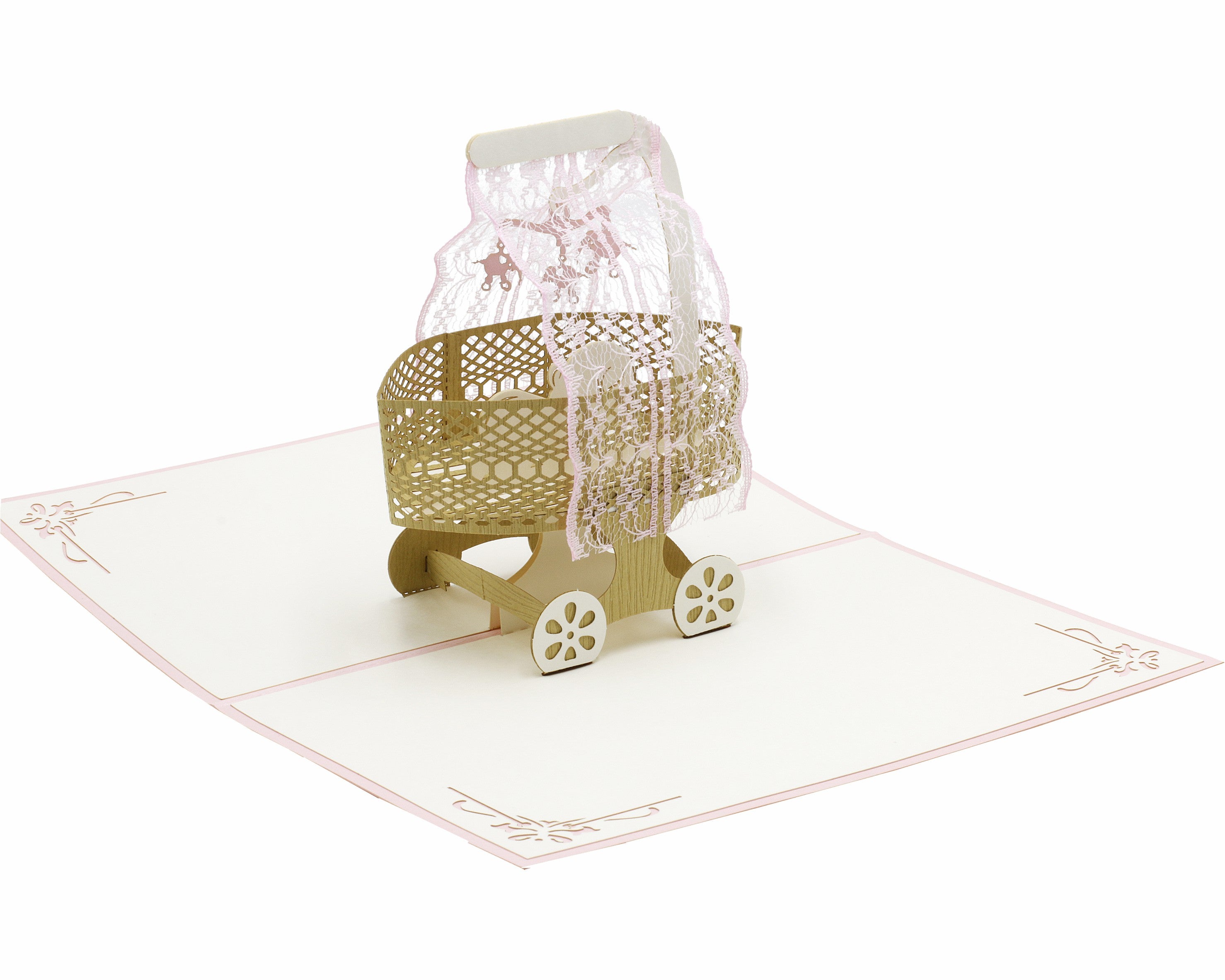 Beim Aufklappen dieser 3D Karte verzaubert Dich ein filigran gearbeiteter Stubenwagen, in dem ein kleines Elefanten Mobile hängt.
