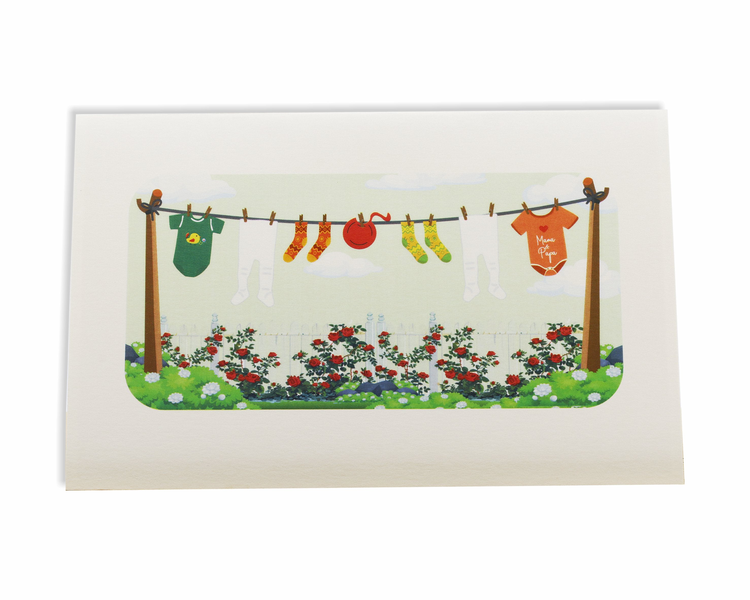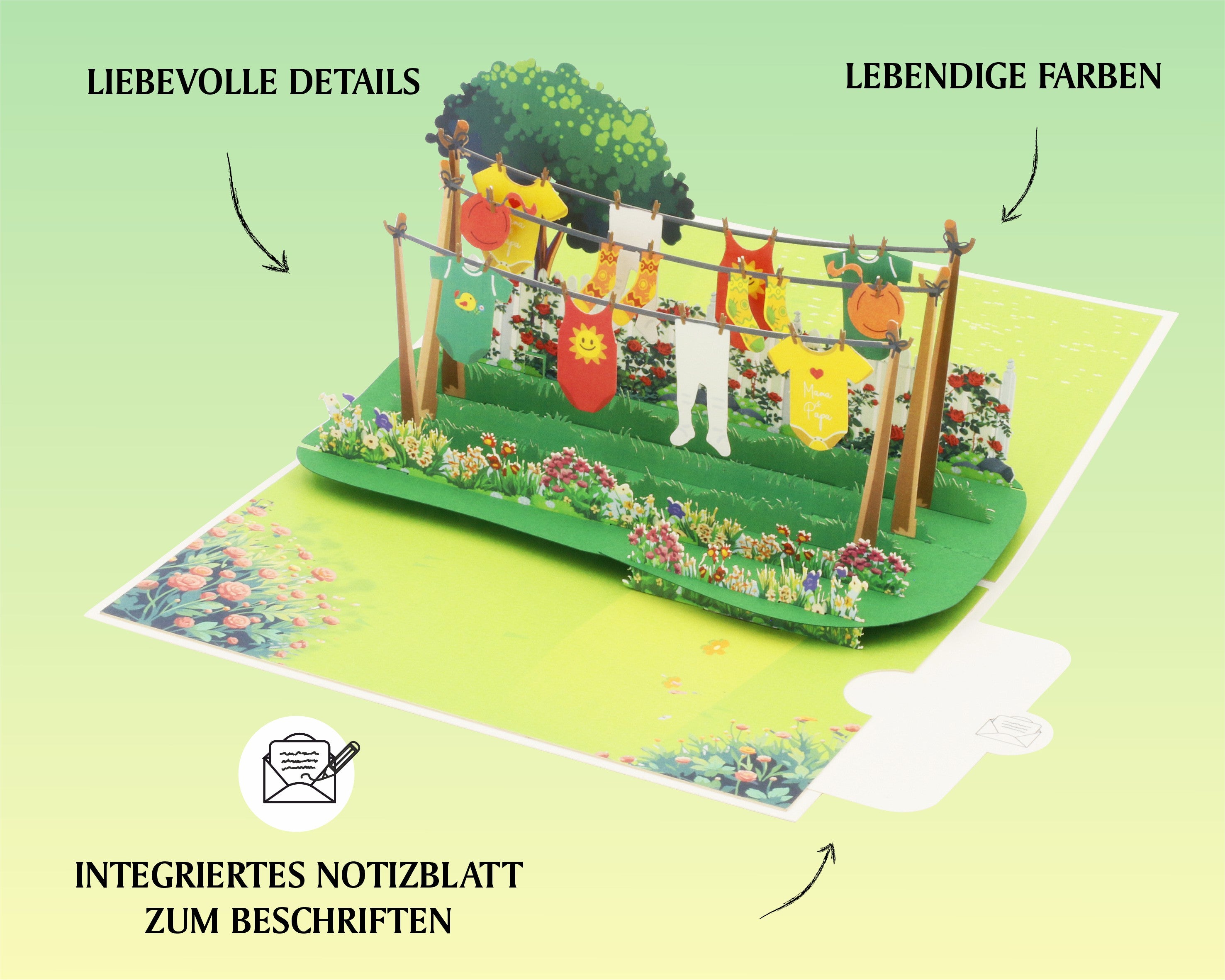 Beim Aufklappen dieser 3D Karte verzaubern Sie filigran gestaltete Strampler, die ab sofort zur täglichen Wäsche gehören...