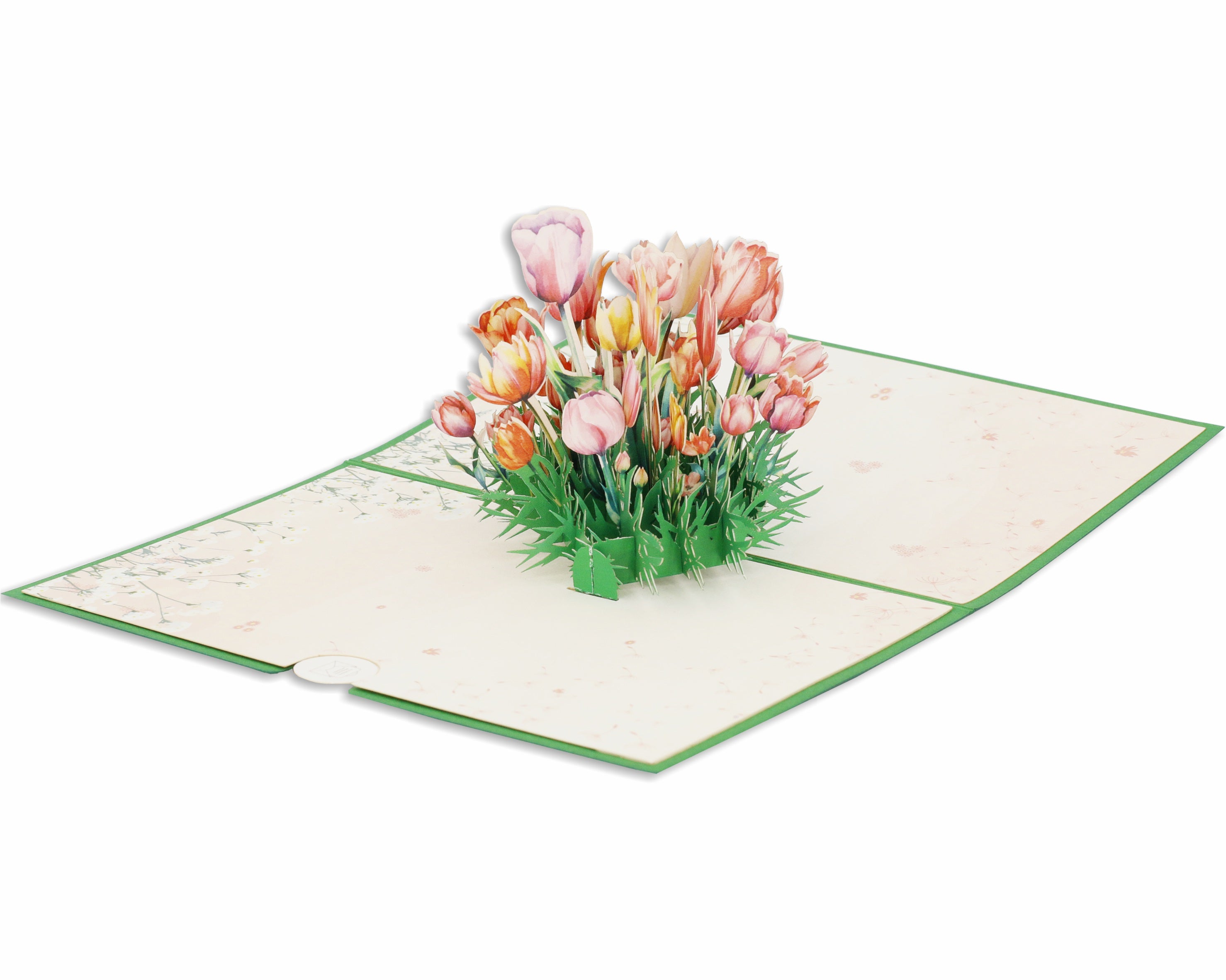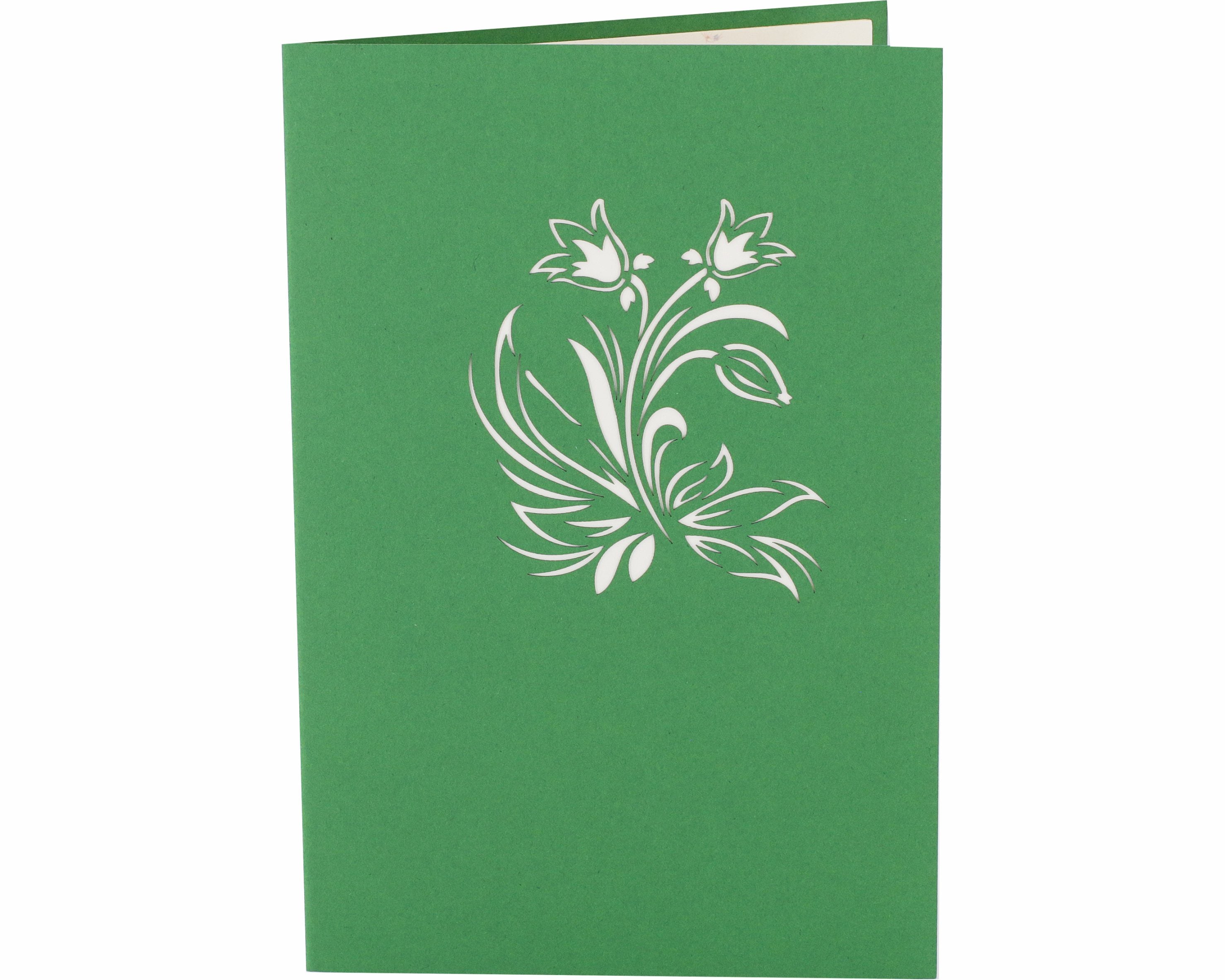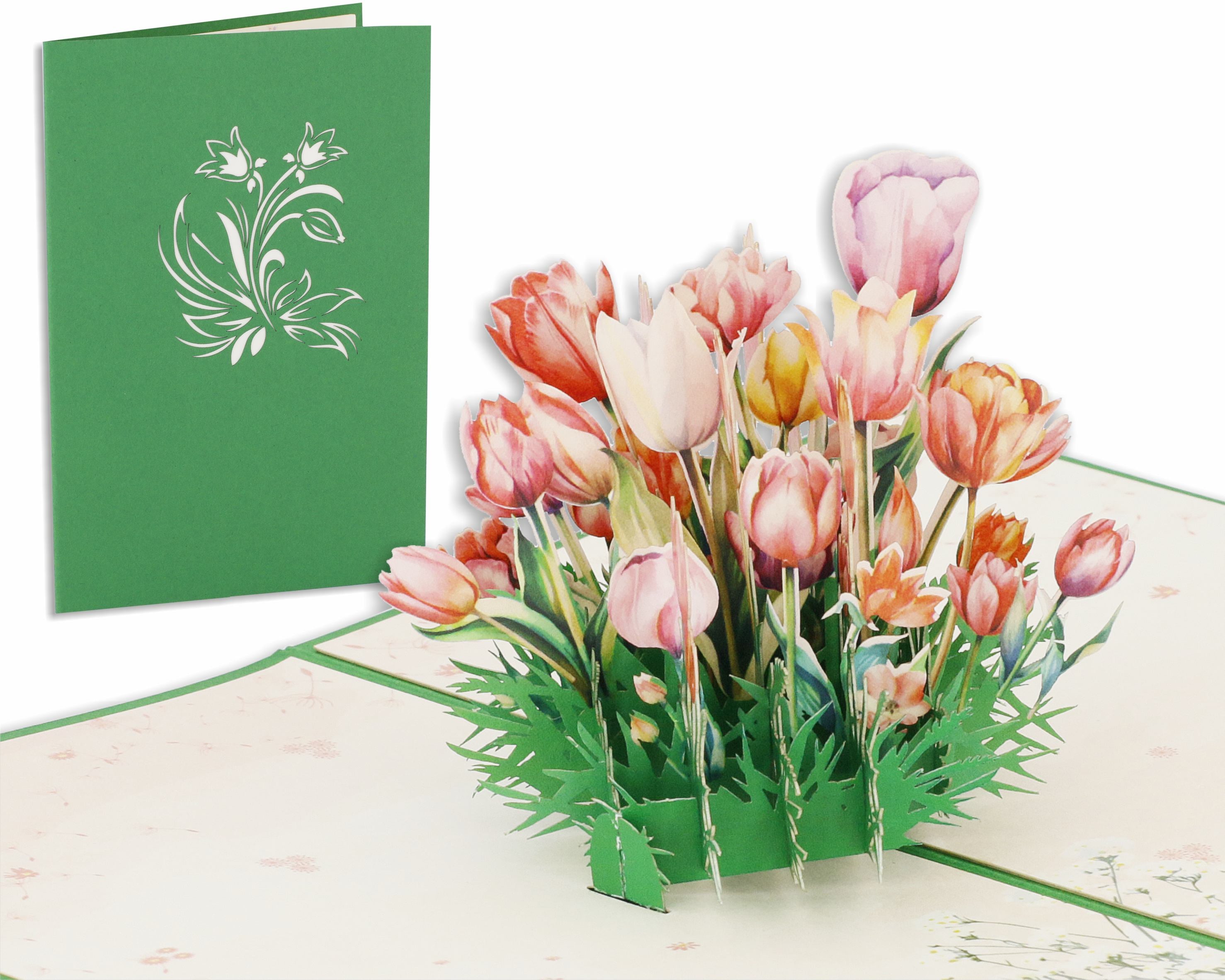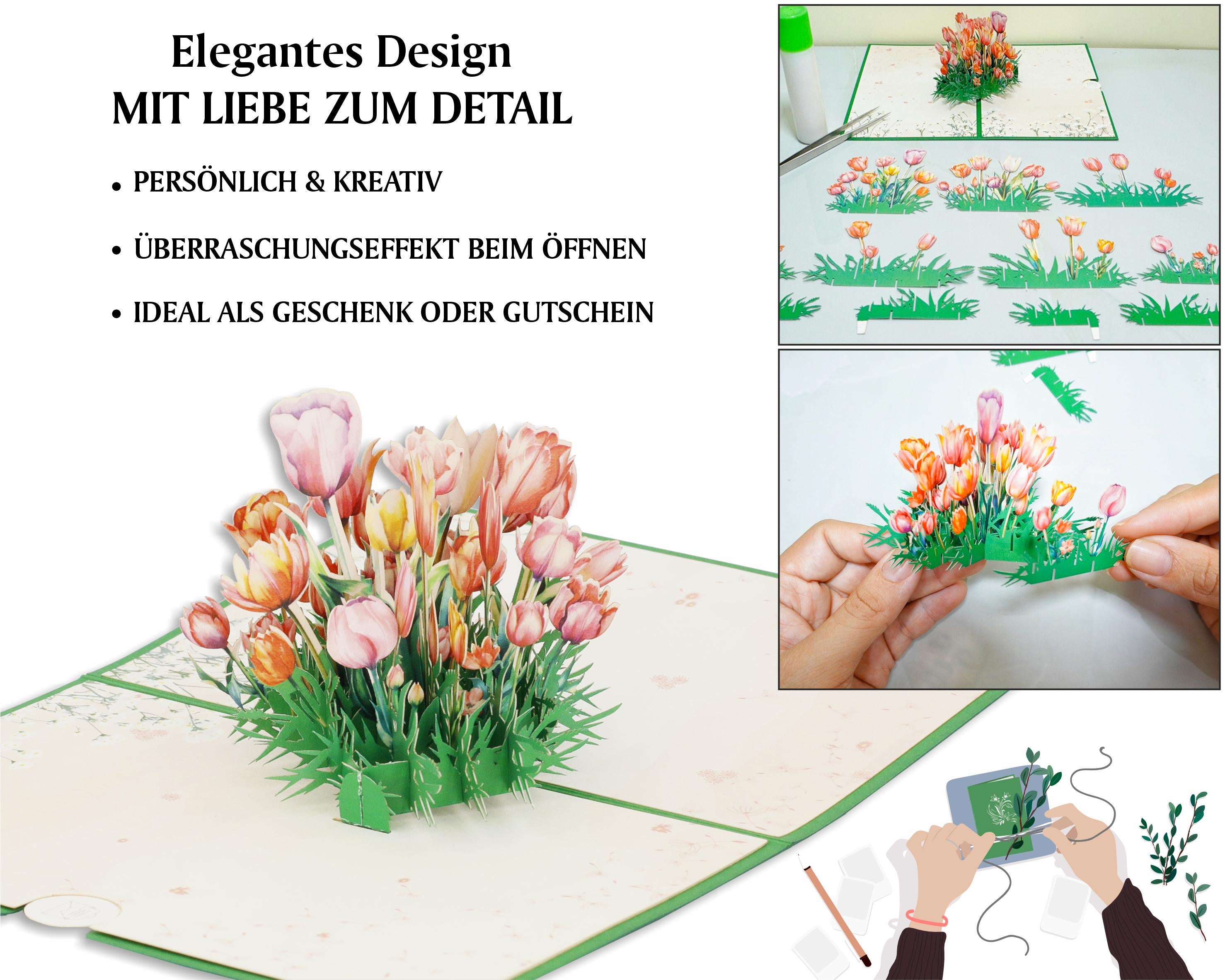 Beim Aufklappen dieser 3D Karte verzaubert Sie ein filigran gearbeiteter Tulpenstrauß, der garantiert nicht verwelkt.